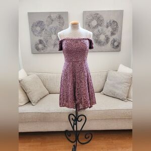 AN106 (tags: cocktail dress, evening, homecoming, prom, formal, bodycon, knee length dress, party, sweet 16, wedding guest, glittery, shimmery, shiny, illusion, date night, Valentine's day, fitted, fit flare, skater, shoulder baring, juniors size medium, mini dress, hi lo, high low, purple, mauve, off shoulder, off the shoulder)