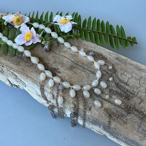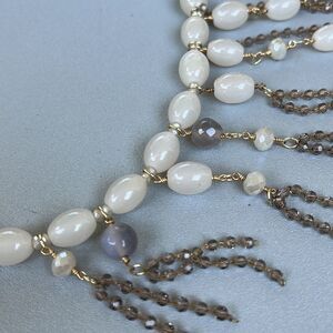 This beautiful glass bead necklace from the well known brand Serefina is a great closet addition. Creamy colored oval stones form the main part of this pretty piece and strands of small gray beads in tassel form hang delicately !! Lobster claw clasp and 3" inch extender chain.