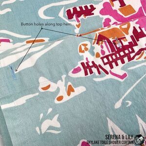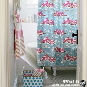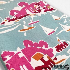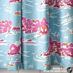 In an unconventional pink and turquoise color palette, this pattern: ‘Skylake Toile’ is Serena & Lily’s take on the classic narrative design. Leaving the countryside to go lakeside, the playful pattern is bold in scale and color resulting in a look that’s both fresh and familiar. Printed on heirloom quality 100% heavyweight cotton fabric, this shower curtain is designed for longevity with style. From the summer 2013 collection, this essential is from my personal collection and in excellent condition without issue. For versatile, beachy vibes, look no further.