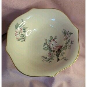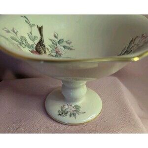 The Serenade Pedestal Candy Dish by Lenox China is a luxurious and elegant serving piece, perfect for all occasions. Made in the United States, this ivory dish features exquisite 24KT gold trim and a beautiful floral pattern. The intricate design, adorned with a bird motif, adds a touch of charm and sophistication to any table setting or holiday display. The original Lenox brand ensures high quality and craftsmanship, making this candy dish a timeless and elegant addition to any collection.