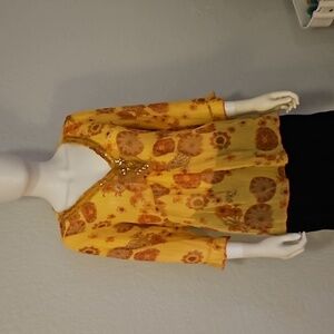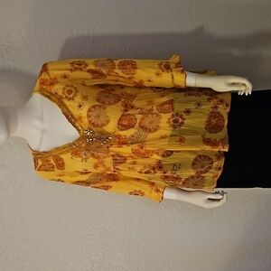 SERENADE Yellow Metallic Floral Sheer Bedazzled V-Neck Blouse