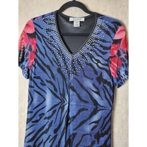 SERENGETI Blue Red Animal Print Floral Silky Knit Bling Maxi Dress SZ M