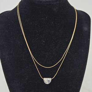 This elegant Anthro 14K gold plated layered necklace features a stunning stone pendant, perfect for adding a touch of sophistication to any outfit. Ideal for both casual and formal occasions. It measures approximately 15" & 16" with a 3" extender. Please see all photos as this is the exact piece you will receive. Thank you so much for looking. I am always open to reasonable offers. Have a beautiful day!