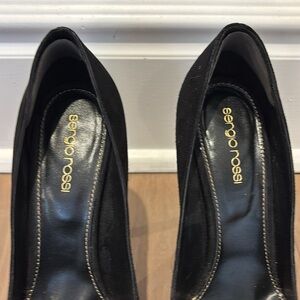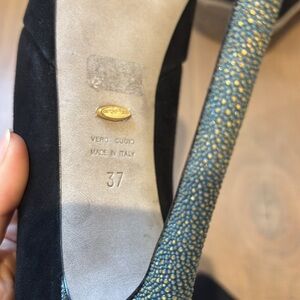 DETAILS: black pump, blue and gold embellishment on heel, gold logo on front and on back, 4” heel