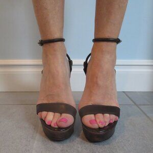 Worn once, look at the pictures, SERGIO ROSSI, made in Italy all leather, brown strappy platform high heel sandals, size 35. 4.75 inch heel with 1.25 inch platforms. "tube" straps around heel and ankle . ankle strap closes with a buckle, Very comfortable and easy to walk in