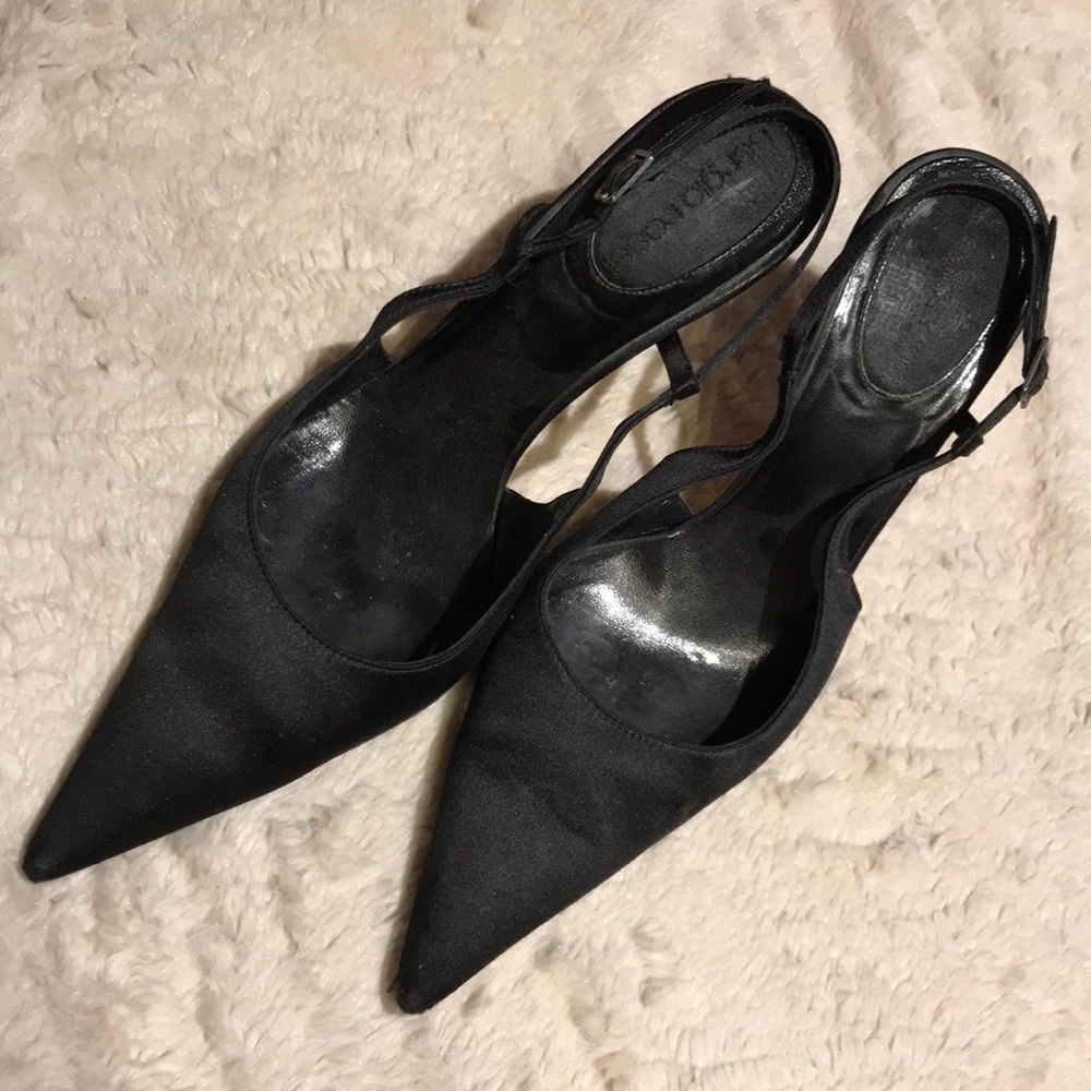 STUNNING SILK black heels you can wear to any occasion. Absolutely gorgeous shoes to dress up any outfit. 100% authentic silk. Super cool modern heel.