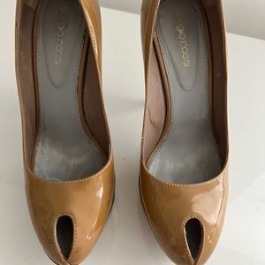 Tan patent leather peep toe with platform heels.