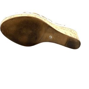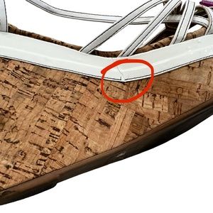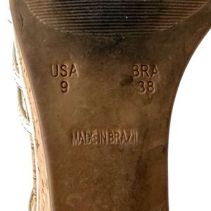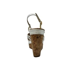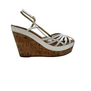 Sergio Zelcer white patent leather upper and cork bottom sandal platform wedges. Adjustable with gold buckle. The white has black stitching. There is a stitch that popped at the bottom of the white strip around the top of the cork where the seams meet inside the shoe. Circled in one picture, but is on both. There are some scuffs on both shoes on the white. It may come off with polish. See photos. They were not worn much so there is only a little wear on the soles. Very comfortable! Made in Brazil. In good preowned condition.