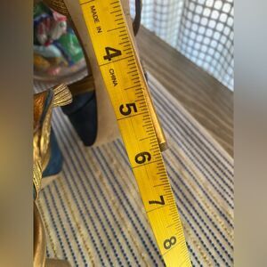 Elegant metallic gold heels with intricate strap design. Perfect for adding glamour to any outfit.