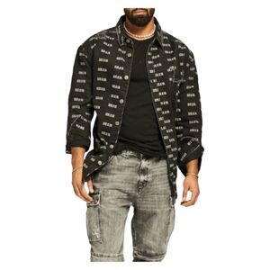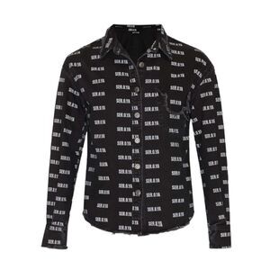 SER.O.YA Alex Denim Shirt Jacket in Black and White Midnight Logo Printed Pattern. It is an Oversized denim button down shirt with Western-inspired seam on back, a Single Distressed Chest Pocket and a all-over Logo printed pattern.