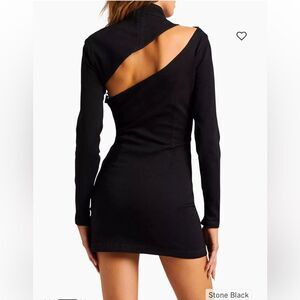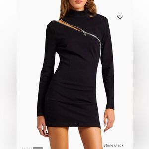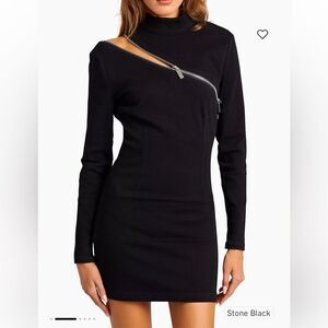 Turtleneck, long sleeve mini dress with a functional zipper across the chest. Can be worn as a fashionable cutout or a one shoulder look.
