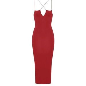 This jersey bodycon midi dress with barely-there criss-cross straps and cutout detail at bust is an elegant night out dress.
