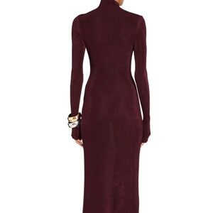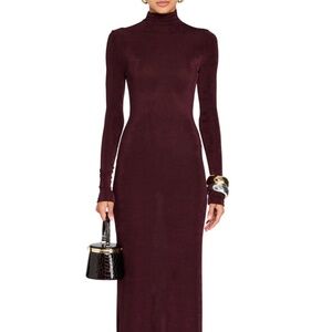 Long sleeve, high neck maxi dress. Shown here in Merlot.