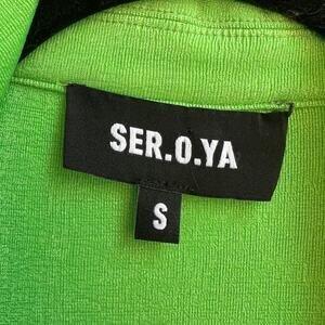 SER.O.YA lime green 'Daytona' mini dress. Stretch collared dress with wrap detail. Covered buttons at wrists. Vented flared oversize cuffs. In overall great condition, but missing one sleeve button on the right cuff. Size small - 16" pit to pit; 11" waist flat but has lots of stretch; 23" length from pit; 29" sleeve length