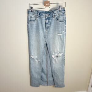 Features thigh high slit up front and slight distressing throughout