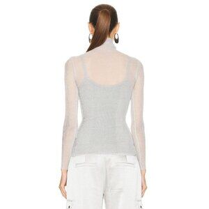 Lightweight long sleeve turtleneck sweater cut in sheer ribbed fabrication.