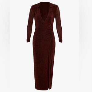 SER.O.YA, Retrofête, Retrofete, Revolve, Luxury, Velvet Dress, Midi Dress, Wrap Dress, V-Neck, Long Sleeve, High Slit, Bodycon, Fitted, Cocktail, Evening Wear, Holiday, Chocolate Brown, Cocoa, Dark Brown, Neutral, Fall, Winter, Luxe, Sultry, Velvet, Stretch Knit, Polyester, Elastane