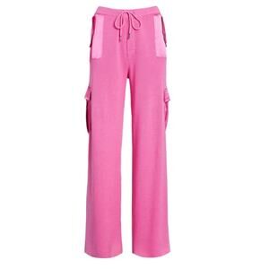 Wide leg knit pants with drawstring waist and satin cargo side pockets. Shown here in Malibu Pink. Shown here in Malibu Pink.
