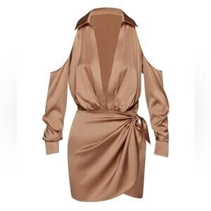 Silk shirt dress with plunging neckline. Cold shoulder sleeves and slight slit at side.