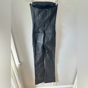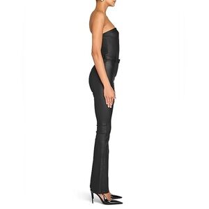 Strapless, fitted coated denim jumpsuit with subtle flare leg.