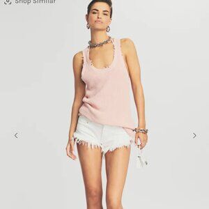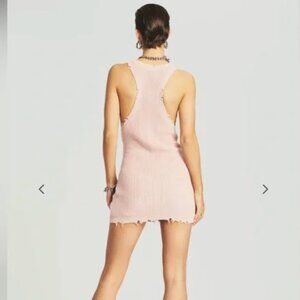 Cotton knit racerback tank dress. Lightly distressed ribbed trim at neckline, shoulders, and hem.