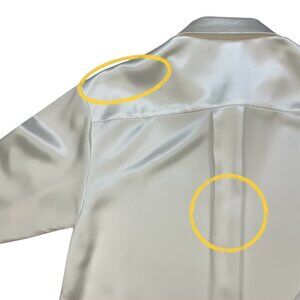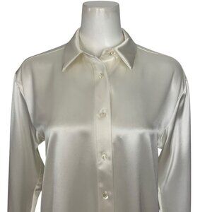 This SER.O.YA women's Zucker Shirt Blouse makes a statement due to it's long sleeve, exaggerated cuffs, spread collar, relaxed fit, high low curved hem and off white lightweight satin fabric.
