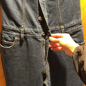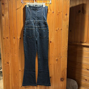 Seroya April denim jumpsuit in a dark wash. Strapless with button up bodice and zipper fly. Flare leg. Very long and can easily be tailored, will definitely give an elongated look! No callouts. Stock photo added for reference from the website.