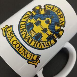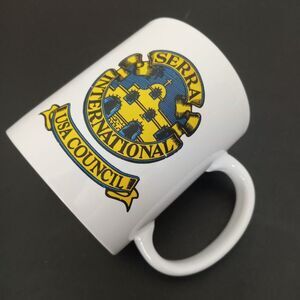 Serra International USA Council Coffee Mug, White Porcelain, Gold, Blue, Black Logo on One Side. A RARE FIND! I cannot locate another one like it online. Holds 12 Ounces. Measurements: 3 3/4" x 3" Mint Condition. See Photos for Condition Details. Smoke Free Home.