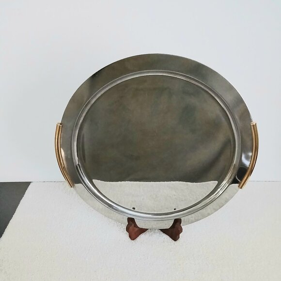 STAINLESS STEEL - High Gloss Serving Platter (never mind the photo's reflections) - with Genuine BRASS Handles; Measures approx. 14 1/2" wide.