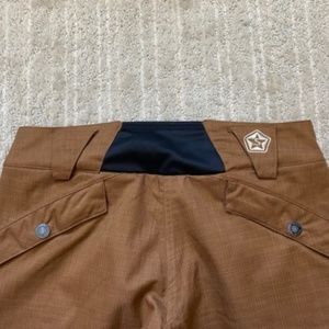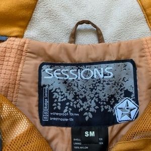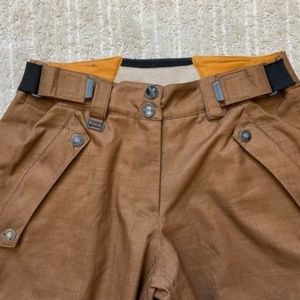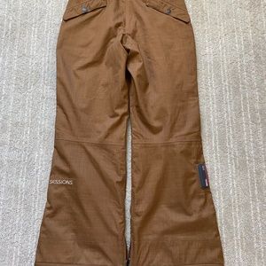 Sessions Brand, Women's Ridge Series, Size Small. Waterproof and Breathable. Color is Brown (more of a golden/rusty brown). Pants are lined. No holes or tears. All zippers functional. Adjustable waist. Equipped with Recco Avalanche Rescue System. Only flaw noted is the coating on buttons has rubbed off some (see photo).