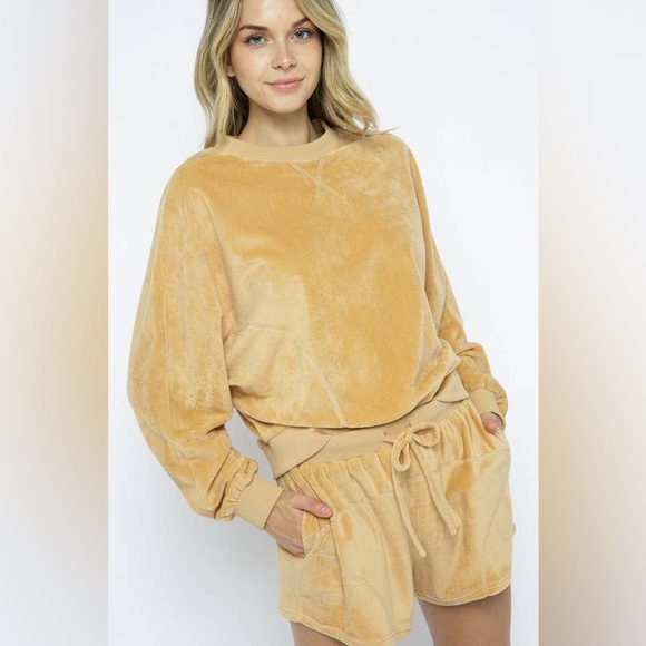 So comfortable and soft two pieces shorts and sweatshirt, like a gold color