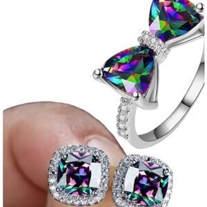 🌟SET! 925 Rainbow Diamond CZ Bowknot Ring & Matching Earrings New Gift Box