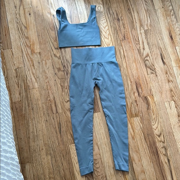 Green-ish two-piece activewear set. Includes a crop top and high-waisted leggings. Perfect for workouts or casual wear.