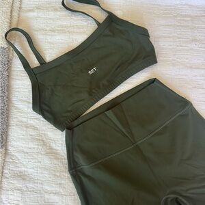 Sleek olive sports bra and shorts set. Ideal for workouts or casual wear. Sports bra is size medium, and biker shorts are size large. The biker shorts are a 5-inch inseam. #setactive #set