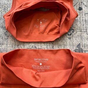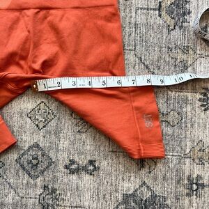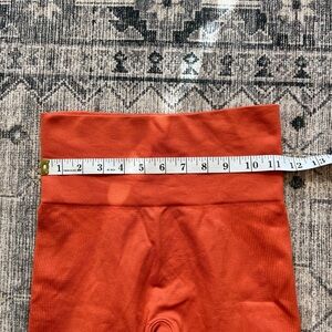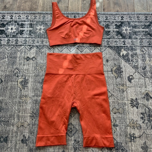 EUC SET ACTIVE women’s seamless bra and biker shorts set size M/L top, XS/S shorts. This set is super cute and perfect for fall! An acorn orange color, bra is a bigger size, M/L and biker shorts are a smaller size XS\S. Bra shows a little more wear than shorts as pictured, just a few extra wears and fuzzy from wash and wear! Check photos for measurements in inches!