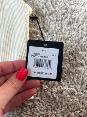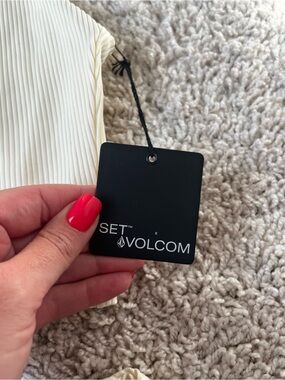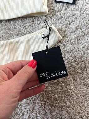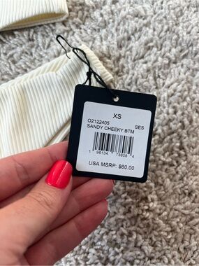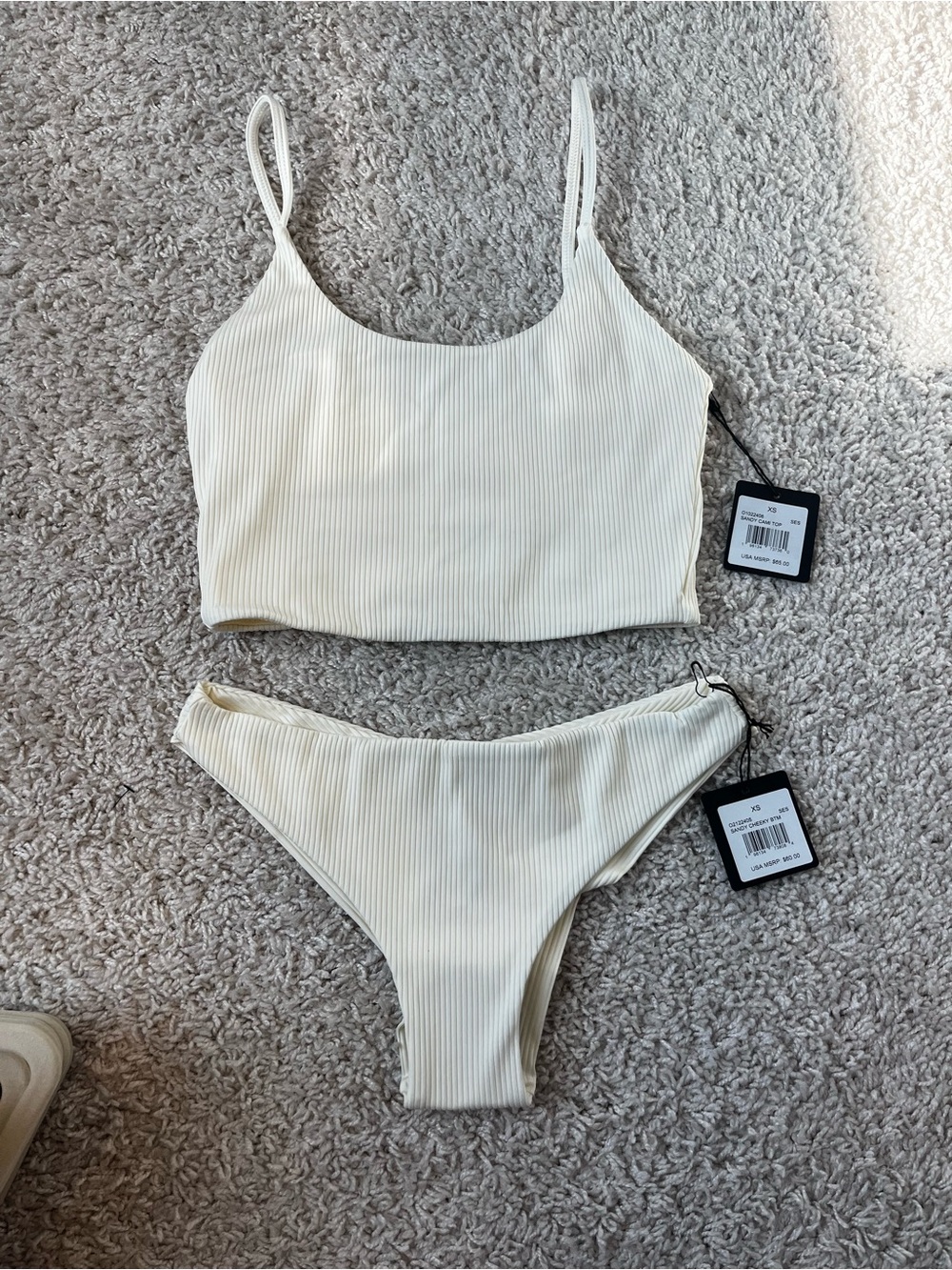 Ribbed cream bikini top with thin straps. Matching ribbed cream bottoms. Modern, minimalist swim design. Brand tag attached.