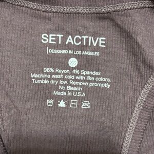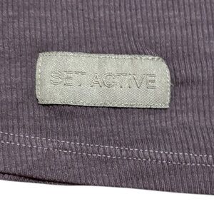Ribbed tank top with crew neckline. Soft mauve hue. Small printed SET ACTIVE label at inner neck. Stretchy rayon-spandex fabric. Minimal, everyday style.
