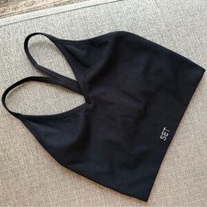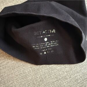 Sleek black ribbed design. Offers support and style. Ideal for active wear. Excellent condition