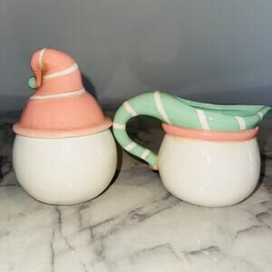 SET Johanna Parker KITSCH Pink Coffee Mug Sugar Bowl Creamer Santa Snowman Elf
