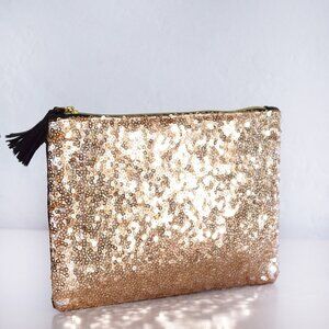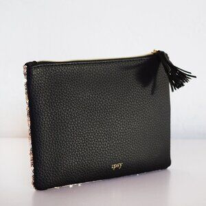 1. Size approx. 7.5"(W) x 5"(H) Ipsy double-sided reversible (gold sequin/black) makeup bag with tassel zipper pull.