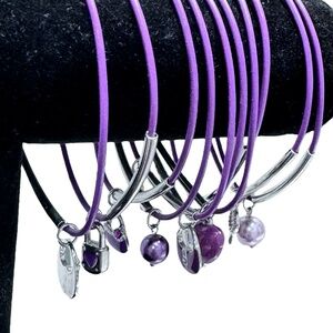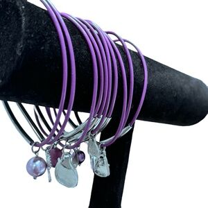 Vintage set of 10 purple bracelets. I'm not sure of the material of the bracelets. It feels like rubber but doesn't stretch. Each bracelet has a 1.5" long silver tone bar. There is a unique charm on each bracelet. The bracelets are elongated from storage and the charms. They should hang properly when worn. In excellent preowned condition. Measures approximately 7" around.