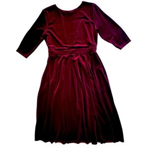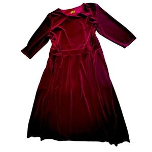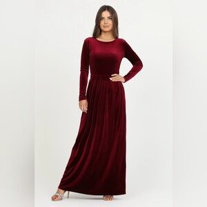 Burgundy velvet round neckline dresses. One long sleeve one 3/4 length. These dresses are midi to maxi length depending on height. Please review measurements provided below. Material is high quality, flexible and stretchy. The top of the dress is lined.
