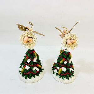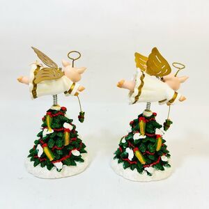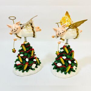 SET OF 2 Hand Painted Resin Christmas Tree with Piggy Angel Bobblehead Topper