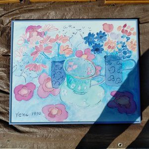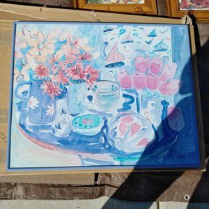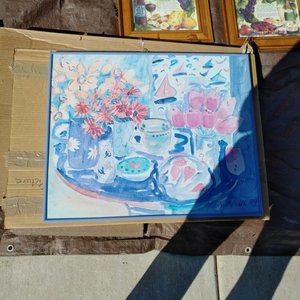 SET OF 2 PRETTY PINK AND PERIWINKLE PRINTS IN MATCHING PERIWINKLE METAL FRAMES - Cute and fun Set of 2 Pink & Periwinkle Prints in Matching Periwinkle Metal Frames. Prints are protected with glass. One Print depicts a Breakfast Table overlooking the water with sailboats floating by and the other depicts a Table set for tea. Both Prints include many colorful flowers. Creates a cheery and upbeat vibe to liven any room.