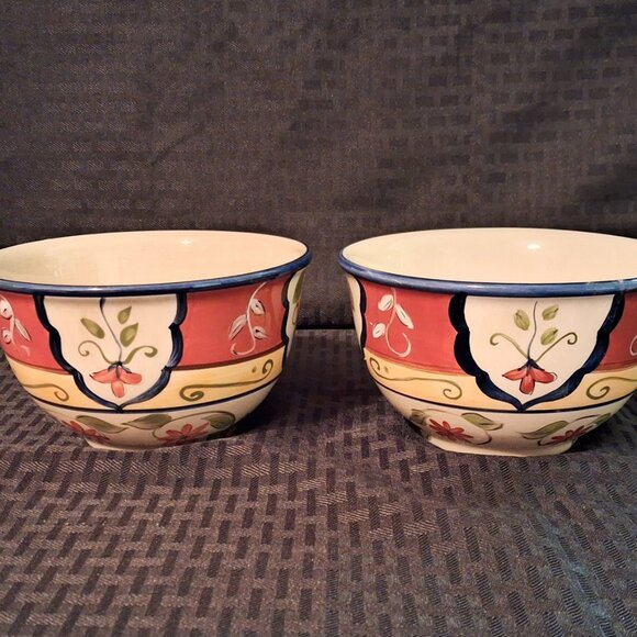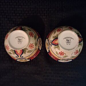 The SET OF 2 Pier 1 VALLARTA 5 7/8" Soup, Cereal Bowls features a colorful Vallarta pattern in red, blue, yellow, and beige. These round earthenware bowls are microwave safe, hand-painted, and dishwasher safe, making them perfect for all occasions. As part of the Pier 1 Imports product line, these glossy finished bowls are a decorative and functional addition to any kitchen or dining table.