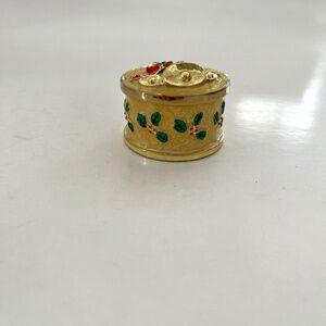 New tea lights with Christmas bells on lid in enameled gold metal with rhinestones. Measures 2" x 2".