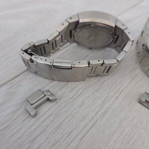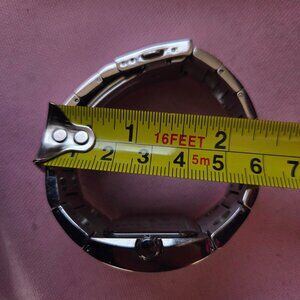 Metal, sleek, tough and elegant all wrapped up in one. Stainless steel, curved mineral crystal face, and ventilated stainless steel contoured cuff.