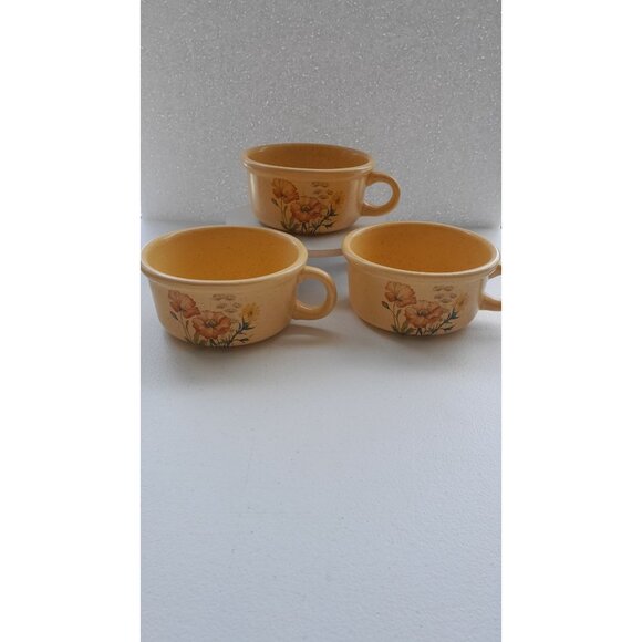 Vintage 1970's set of (3) Treasure Craft Crockery Inc. soup bowls in the Wildflowers pattern, item # 858. These are great quality stoneware pieces that are perfect for a nice hot bowl of soup, or even a hot cup of cocoa on a cold day! Made in the USA, preowned and free from chips or cracks. Measurements are: 2.5" tall, 6.25" wide including the handle with a 5" diameter opening. Please see photos as they are part of the description. Smoke free home. Reasonable offers considered.