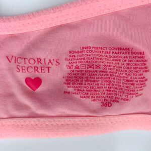 Set of 4 women's Victoria's Secret Lined Perfect Coverage cotton underwire bras, all size 36D and in excellent condition with minimal visible wear (hot pink has small area of faint color marking at side, may wash out, no impact to wearability). Includes 4 bras: colors are solid pink, solid red, heathered periwinkle blue, and hot pink with white pinstripes.