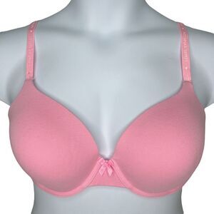 This bra style is perfect for everyday wear and features lightly lined cups in soft cotton fabric for a smooth and comfortable fit under a t-shirt. Bow detail at center gore. Adjustable elastic straps with knit-in Victoria's Secret logo. Solid pink and heathered blue have convertible straps that can be worn regular or crossback. Back closures on all have 3 rows of 2 hooks each.